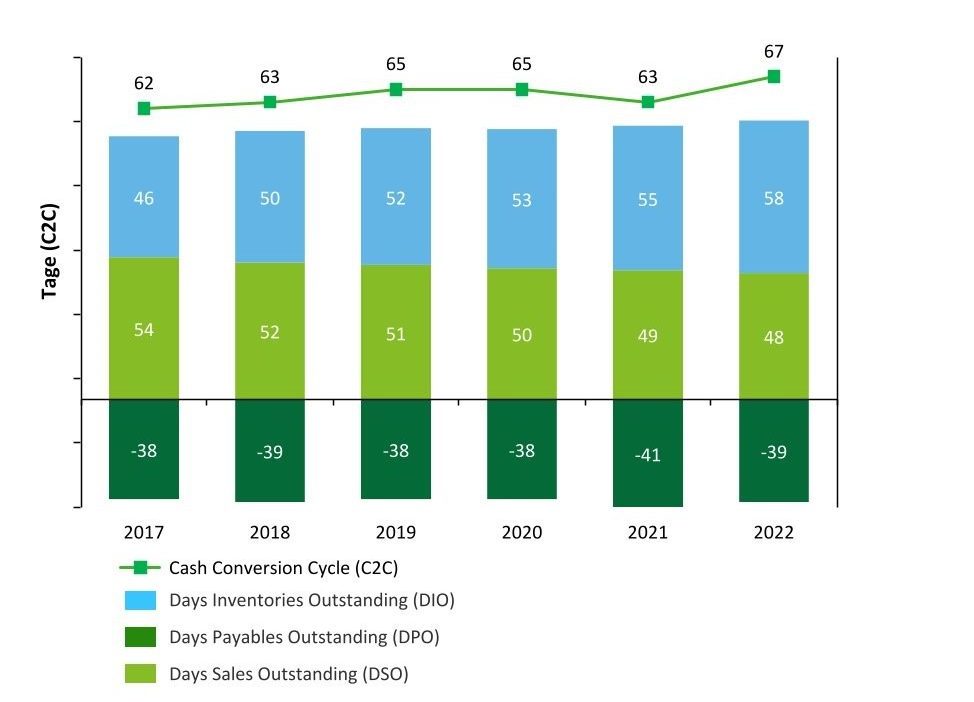 1 Quelle: Deloitte Working Capital Report 2023; hier Auswertung der Bilanzdaten der 167 größten deutschen Unternehmen im Zeitraum der Geschäftsjahre von 2017/2019 bis 2022.