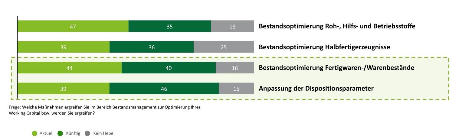 Die Bestände waren im Vergleich der Jahre 2017 bis 2021 mit dem Jahr 2022 wesentlicher Treiber der Kapitalbindungsdauer. Diese Entwicklung spiegelt sich in den operativen Maßnahmen der Unternehmen wider (s. Abb. 2). Diese betreffen alle Bestandskategorien. Maßnahmen zur Optimierung der Halbfertig-, Fertigwaren-/ Warenbestände sowie die Anpassung der Dispositionsparameter haben dabei die höchste Priorität.