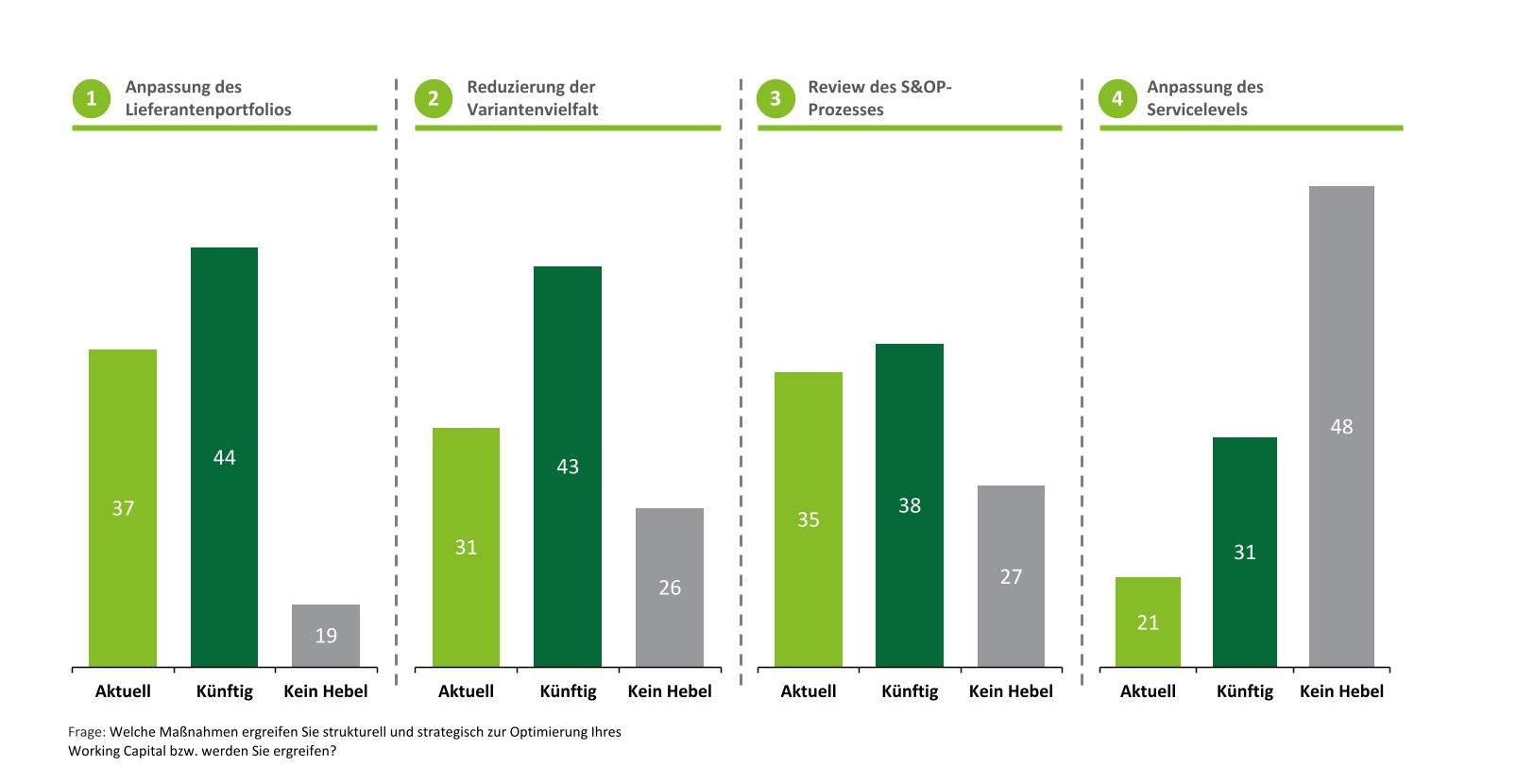 - Im Bereich des Debitoren- und Kreditorenmanagements gewinnen die Intensivierung des Forderungsmanagements sowie Nachverhandlungen der Zahlungsbedingungen an Bedeutung.