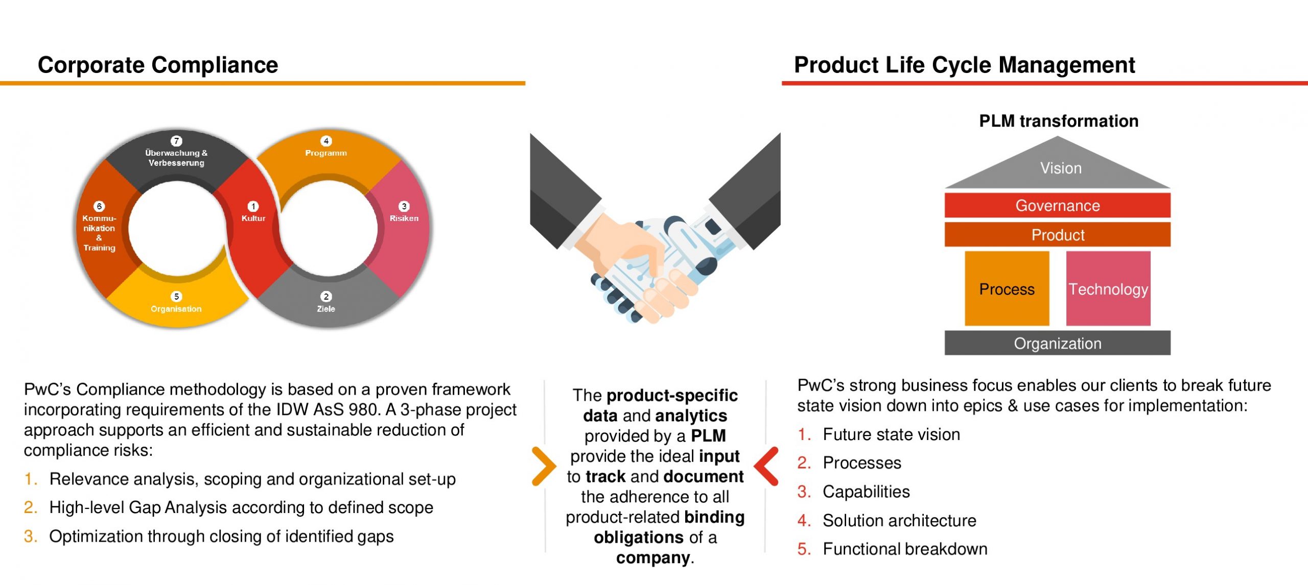PwC offers a variety of different services around the topics of Compliance and PLM, which ideally complement each other. Source: PwC