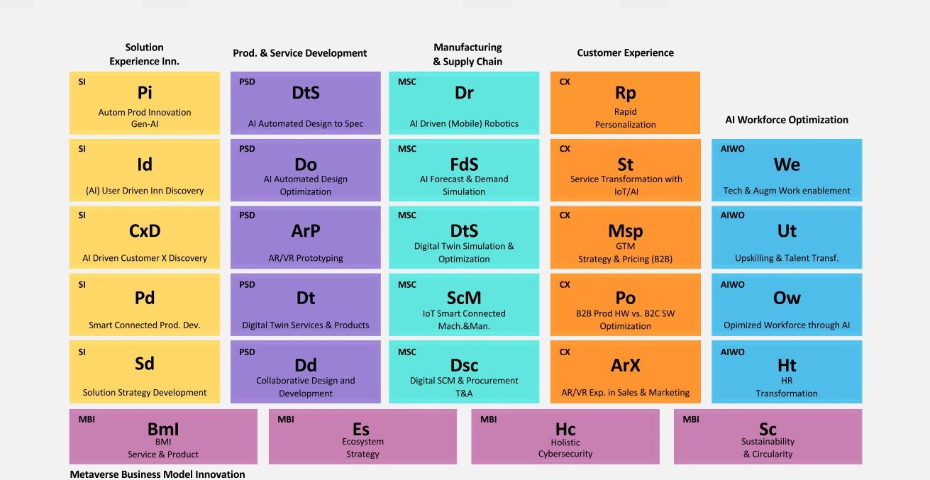 Eine mögliche Strukturierung ist das „Periodensystem“ der Transformation, das beispielsweise Elemente in die Säulen „Metaverse Business Model Innovation“, „Solution Experience“, „Product & Service Development“, Manufacturing & Supply Chain“, „Customer Experience“ und „AI Workforce Optimization“ einordnet. Einzelne IT-Lösungen müssen nicht eindeutig zugeordnet werden, sondern können für mehrere Zielbildelemente genutzt werden. Basierend auf dem gemeinsamen Nordstern kann die Transformation entworfen und entsprechende Maßnahmen und Wachstumspfade definiert werden.
