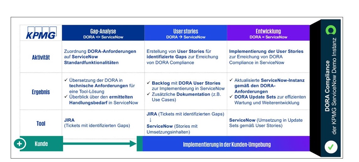 Am Beispiel von ServiceNow lässt sich exemplarisch ein strukturierter Prozess zur Erreichung dieser DORA-Compliance aufzeigen (siehe Abbildung oben).