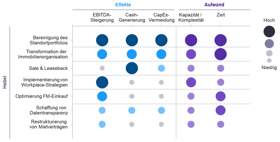 • Kurz- bis mittelfristig (1-3 Jahre) können durch die Optimierung des Einkaufs von Facility- und Property-Management-Leistungen, inklusive der Konsolidierung und Neuverhandlung von Serviceverträgen, sowie durch die Einführung moderner Workplace-Strategien, große Einsparmaßnahmen erzielt werden.