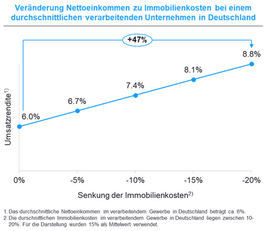 Ein Beispiel: Bei einem durchschnittlichen Industrieunternehmen liegt die Umsatzrendite bei rund 6 Prozent, der Anteil immobilienbezogener Kosten etwa bei 15 Prozent.