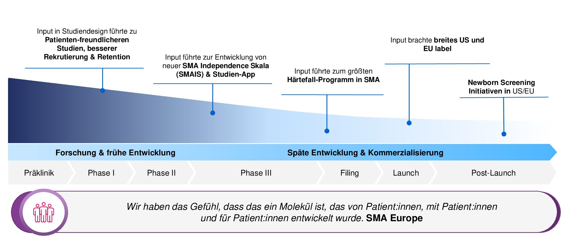 Studienendpunkte, z.B. der Entwicklung der SMA Independence Scale, einer neuen Skala zur Bewertung des Unterstützungsbedarfs bei alltäglichen Aktivitäten. Die involvierten Patientenorganisationen erleichterten die Teilnahme und Rekrutierung der Zulassungsstudien, indem sie Familien beim Umzug an Studienstandorte in anderen Ländern unterstützten. Während der COVID-19 Pandemie führte der enge Austausch zu Maßnahmen, die die Fortführung der Studien trotz Einschränkungen ermöglichten, wie zum Beispiel die Lieferung von Medikamenten nach Hause und häusliche Pflegedienste.