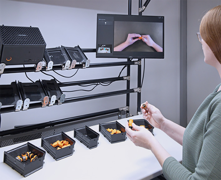 Aufgrund dieser Erfahrung entwickelten wir das Werkerassistenzsystem ifm mate, einen „digitalen Kollegen“, der die Mitarbeitenden an ihrem Arbeitsplatz mit Hilfe einer KI-basierten Bildverarbeitung unterstützt. Eine 2D/3D-Kamera erkennt die Hände des Werkers und folgt seinen Handgriffen. Im Falle eines Fehlers wird das dem Mitarbeitenden sofort auf einem Bildschirm angezeigt. So lassen sich Flüchtigkeitsfehler zum Beispiel beim Verpacken unserer Sensoren verhindern, was die Rücklaufquote deutlich senkt.